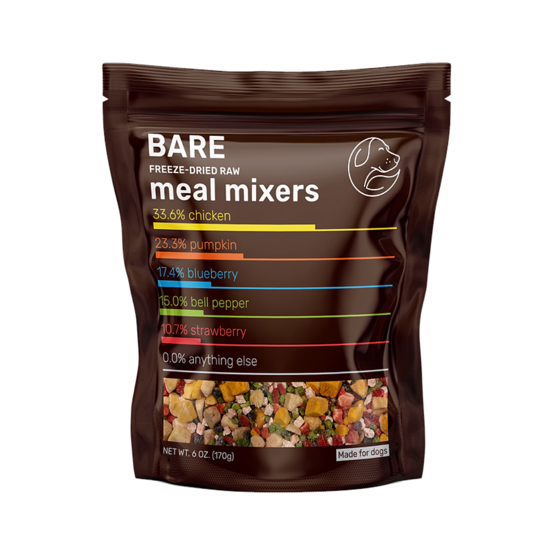 Just 5 ingredients, nothing else. Freeze-dried raw protein, vegetables, & fruits bringing a punch of flavor & nutrients to every occasion. The flagship meal mixer from Bare. Mix into your dog's daily meals, use for the tastiest lick mats, or use as a healthy snack! Bare is great for picky eaters!
