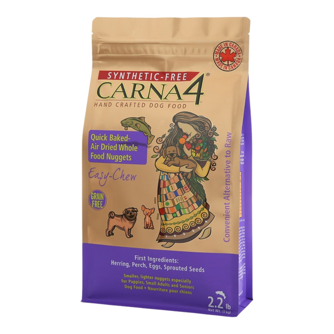 Carna4 Easy-Chew Fish variety is whole food nutrition for all life stages of your dog customized with a slightly softer, smaller nugget – perfect for the little mouths of puppies and small breeds, as well as older dogs that have trouble with chewing. Carna4’s delicious air-dried nuggets are highly digestible and so densely packed with whole foods that you may need to feed 10-15% less per day than you are used to. Our Fish formula is loaded with fresh wild-caught herring and perch. We then add whole produce and our amazing mix of certified organic sprouted seeds that have been germinated to unleash a POWERHOUSE of NUTRIENTS naturally, to support your dog’s intestinal health, energy, skin and coat. We then quick-bake & gently dry it to give your dog bio-available vitamins and minerals, without synthetic additives of any kind. No vitamin pre-mix needed nor added, ever.