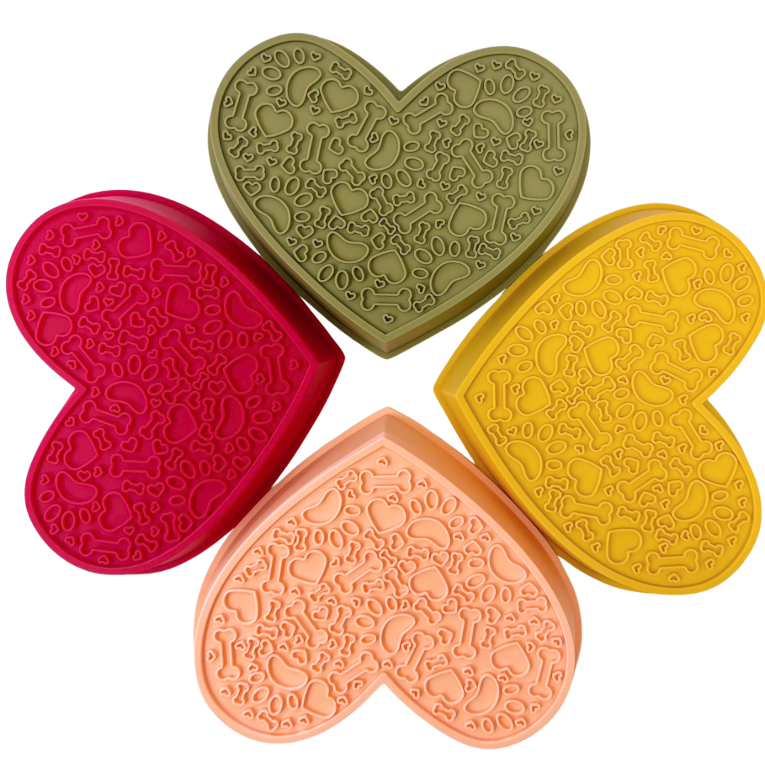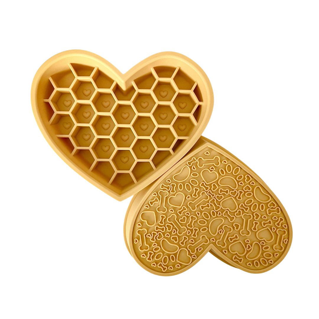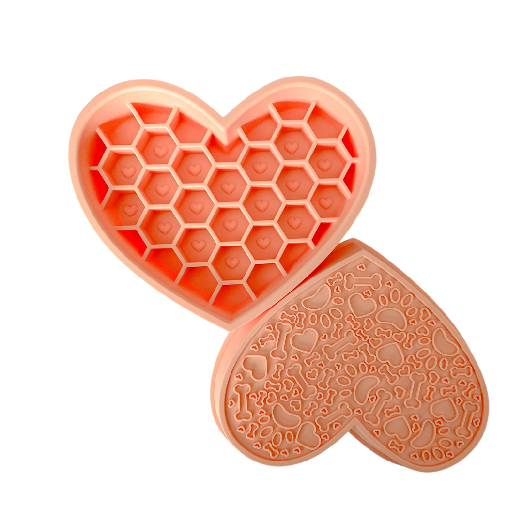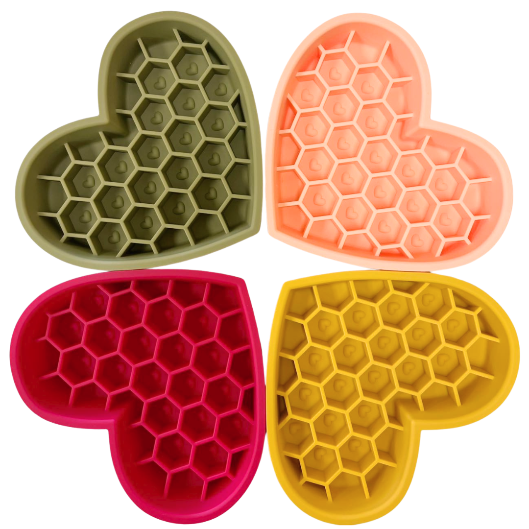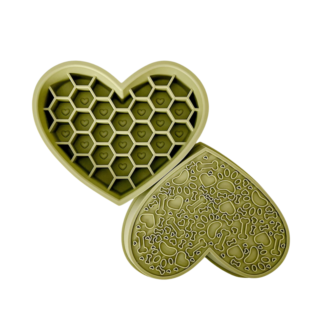 Whether you’re an enrichment pro or don’t know what enrichment is, this grub mat is perfect for your pups next meal. The main design features a heart with honeycomb pockets inside and on the bottom of the grub mat there is a lick mat. Each mat comes with a rubber spatula.